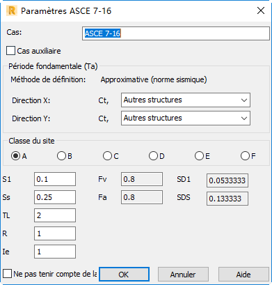 Les paramètres de l'analyse simplifiée sismique d'après la méthode de force latérale équivalente dépendent d'une norme sismique et d'une méthode de définition des valeurs des périodes fondamentales sélectionnées dans la boîte de dialogue Analyse sismique.