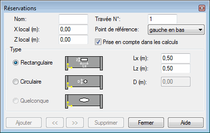Après la définition de tous les paramètres nécessaires, un clic sur le bouton Ajouter valide la définition de l'ouverture et enregistre les données. Les boutons << et >> affichés dans la boîte de dialogue Ouvertures permettent de naviguer dans le tableau des données sur toutes les ouvertures définies.
