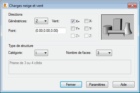 Après la définition des paramètres de base de la structure et un clic sur le bouton Paramètres, le logiciel ouvre la boîte de dialogue Vent sur construction à base polygonal.