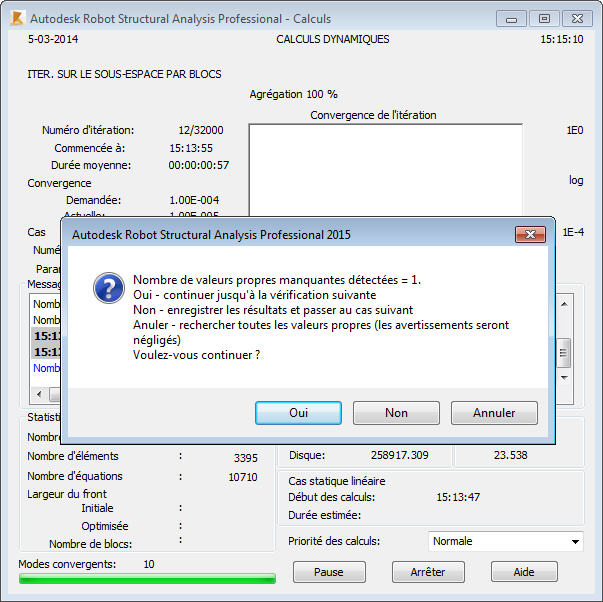 N est ignoré. Les calculs se poursuivent jusqu'à ce que le pourcentage de masses soit au moins égal au pourcentage souhaité, jusqu'à ce que le logiciel propose à l'utilisateur d'arrêter les calculs, ou jusqu'à ce que le nombre de couples propres convergents atteigne la valeur maximale possible. Cette valeur est définie en interne. Elle est fixée à 100 dans la version actuelle. Tous les 20 pas (Lanczos), le nombre de couples propres convergents et le pourcentage de masses participantes sont mis à jour. Un message vous indique le pourcentage de masses obtenu. Plusieurs choix possibles : Oui : Vous lancez le calcul de 20 pas Lanczos supplémentaires avant de revoir ce même message, si le pourcentage de masse n'est pas atteint (le nombre de couples propres convergents ne dépasse pas la valeur maximale possible). Non : Les couples propres convergents sont enregistrés comme résultats finaux et sont transmis au cas suivant. Annuler : Ignorer tous les prochains messages et poursuivre les calculs. |