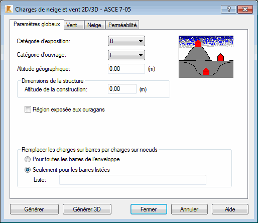 Ouvrir la boîte de dialogue Charge de neige et vent et cliquer sur l’onglet Paramètres généraux affiche la boîte de dialogue suivante :