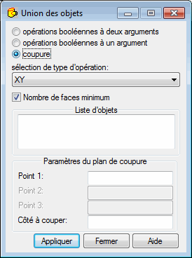 Cette option permet de définir les parties des surfaces des objets sélectionnés qui se trouveront d’un des côtés du plan défini. Le résultat de cette opération est un objet "découpé" dans les objets sélectionnés par le plan défini. Indiquez la direction dans laquelle les objets sélectionnés seront coupés dans le champ Côté à couper.