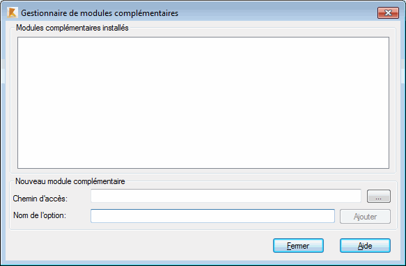 Cliquez sur Modules complémentaires > Gestionnaire de modules complémentaires pour ouvrir la boîte de dialogue Gestionnaire de modules complémentaires. Cette option vous permet d'installer et d'ajouter des modules complémentaires (programmes) aux emplacements appropriés dans le menu du logiciel Robot.