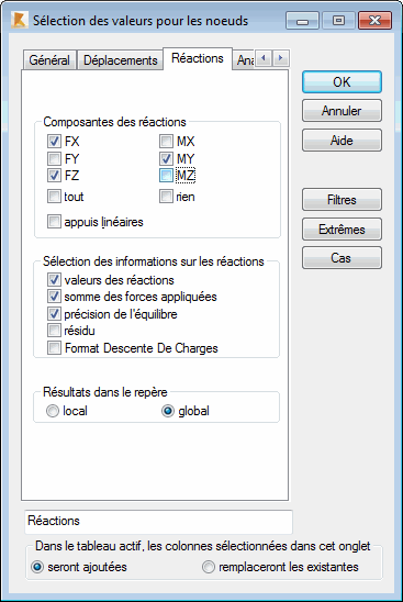 Dans la zone suivante, vous pouvez sélectionner le repère dans lequel les valeurs des réactions obtenues seront présentées (repère local ou global).