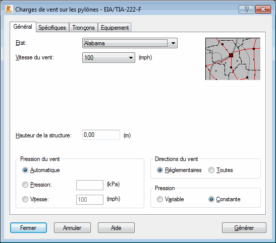 Les boutons standard (Fermer, Aide et Annuler), ainsi que le bouton Générer sont situés dans la partie inférieure de la boîte de dialogue. Cliquez sur ce boutonpour générer une charge de vent sur un poteau ainsi qu'une note de calcul.
