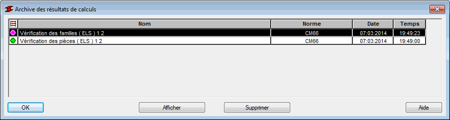 Dans la partie gauche du tableau, à côté des noms des résultats de calculs, l’icône informant sur la compatibilité des résultats enregistrés avec la structure courante est affichée. Si après l'enregistrement des résultats, des caractéristiques importantes de la structure calculée sont modifiées, les résultats enregistrés deviennent non actuels, comme indiqué par l'icône