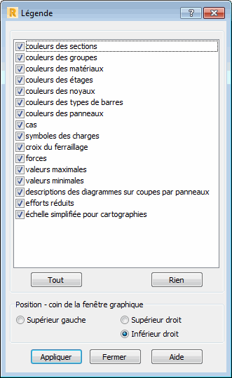 Cette option permet d’afficher sur l’écran la légende pour la structure définie. Dans les paramètres avancés de la boîte de dialogue Légende, vous pouvez sélectionner la description des éléments pour votre dessin. Selon les options sélectionnées, une légende peut comporter une liste des coupes, des groupes ou des noms de cas. Les paramètres dans la boîte de dialogue de la légende permettent d’obtenir les éléments de la description voulus sur l’impression.