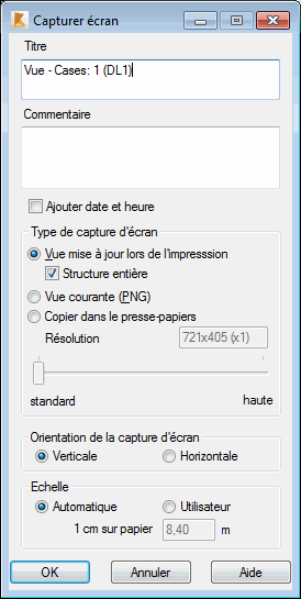 Remarque : La liste des captures d'écran se trouve dans l'onglet Capture d'écran de la boîte de dialogue Composition de l'impression. Depuis cet emplacement, les captures d'écran peuvent être placées dans la documentation de la structure projetée.