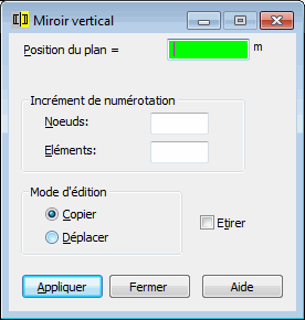 Pour définir la mise en miroir verticale par rapport à un plan, définissez les paramètres principaux dans les champs suivants de la boîte de dialogue Miroir vertical :