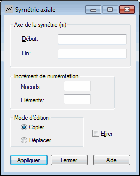 Ouvrez la boîte de dialogue Symétrie axiale, qui définit la symétrie axiale des nœuds ou des éléments sélectionnés, à l'aide d'une des méthodes suivantes :