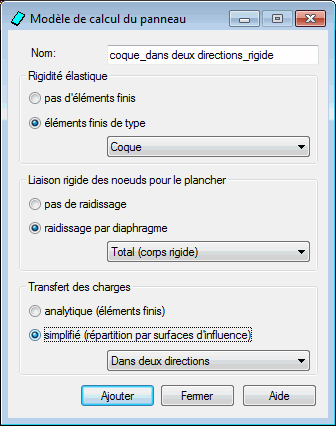 Le modèle de calcul du panneau définit comment on obtiendra la solution pour les déplacements et les efforts internes du panneau et des objets qui le supportent. Le jeu de paramètres composant la caractéristique du modèle de calcul se compose de trois groupes de paramètres :