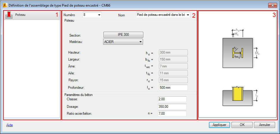 - La partie droite contient la vue graphique de l'élément de l'assemblage poteau-fondation défini.