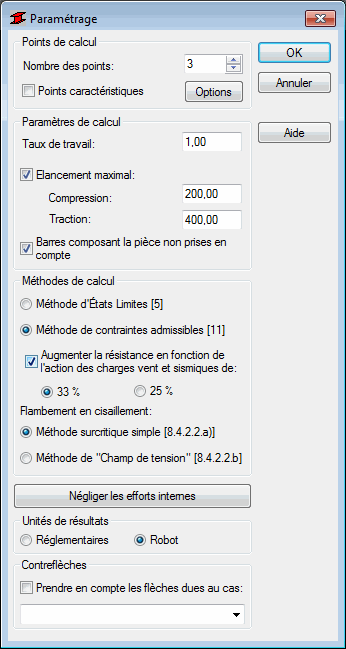 Si vous activez l’option Augmenter la résistance en fonction de l’action des charges vent et sismiques de :, vous pouvez augmenter (conformément au point 11.1.4 de la norme) la résistance admissible calculée de 33 % ou 25 %, pour des combinaisons de charge contenant les cas de vent et sismiques. L’option est disponible seulement si vous avez sélectionné la méthode de Contraintes Admissibles [11].