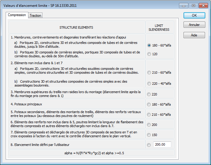 - L'onglet Compression contient un ensemble d'éléments de structure dont les valeurs limites d'élancement d'un élément soumis à compression sont définis par la norme décrite dans le tableau 32. Si un cas comprenant le coefficient alpha est sélectionné, le programme définit alors automatiquement l'élancement limite pendant l'exécution des calculs et le compare à l'élancement réel calculé pour la barre analysée.