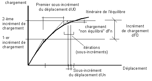Dans la méthode incrémentale, le vecteur de charge du côté droit est divisé en n incréments égaux. Un incrément de charge successif est appliqué à la structure au moment où l’état d’équilibre a été atteint pour l’incrément précédent. La norme pour les forces non équilibrées est donnée pour chaque pas, ce qui permet de suivre le comportement de la relation force-déplacement pour la structure.