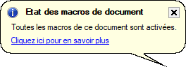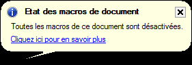 | Demander avant d'activer les macros du document | Définie par l'utilisateur. | Une boîte de dialogue d'avertissement vous invite à activer ou à désactiver les macros. La réponse que vous donnerez entraînera l'affichage de l'icône correspondante. Il s'agit du paramètre par défaut. |