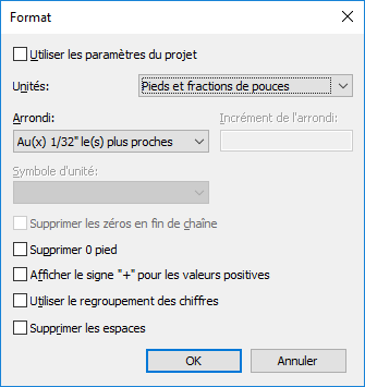 - Sélectionnez Supprimer 0 pied pour masquer les zéros placés au début des cotes, comme dans 0' 6". Cette option est disponible uniquement pour les pieds et les pouces.