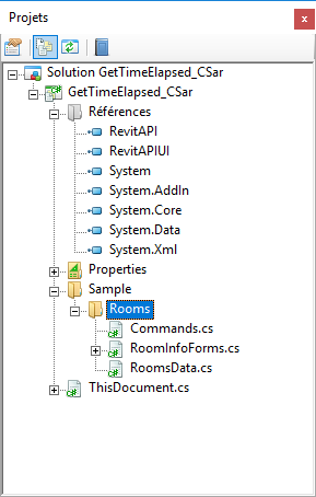 Enregistrez le projet, puis cliquez sur Générer dans le menu de la barre d'outils IDE. Dans Revit, lancez le gestionnaire des macros et sélectionnez votre macro dans la liste classée. Dans le SDK, l'exemple Rooms a peut-être été codé comme macro au niveau du document. Dans ce cas, des changements de code seront nécessaires pour son exécution dans le projet AppCSharp, présenté sur les captures d'écran de cette section.