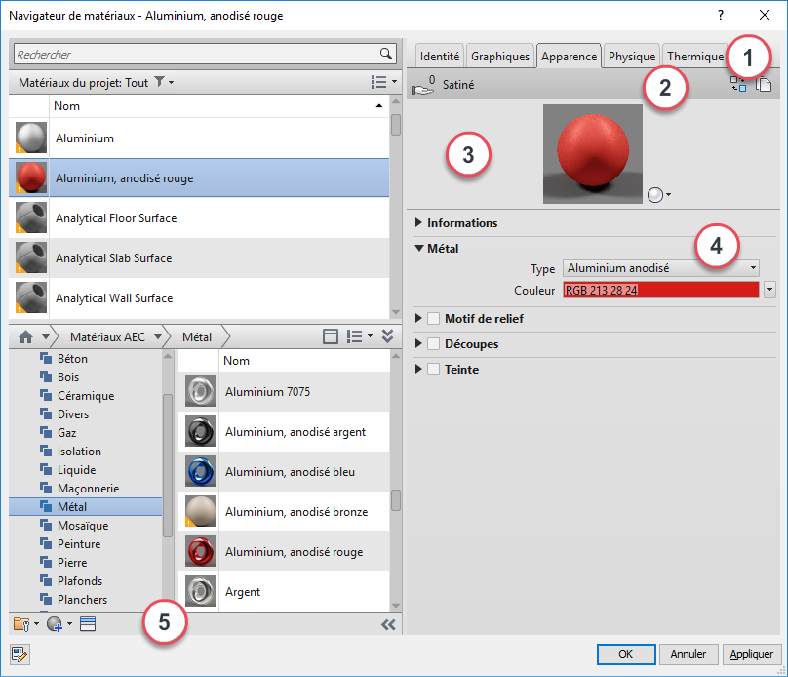 4 Groupe de fonctions Propriétés : permet d'afficher et de gérer des propriétés détaillées de la ressource détaillée. Le nom et la description de la ressource sont affichés dans le groupe de fonctions déroulant Informations. L'exemple ci-dessus illustre les propriétés Métal affichées (développées) pour la ressource Apparence Anodisé - Rouge. L'ensemble de propriétés affichées pour un liquide, par exemple, varie en fonction de l'ensemble de propriétés affichées pour le métal.
