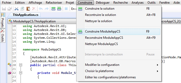 Dans cet exemple, vous intégrez une macro appelée AppCS. Le code de la macro au niveau de l'application en C# réside dans le fichier ThisApplication.cs. Vous pouvez déterminer son emplacement sur le disque dans l'explorateur du projet de l'environnement IDE.