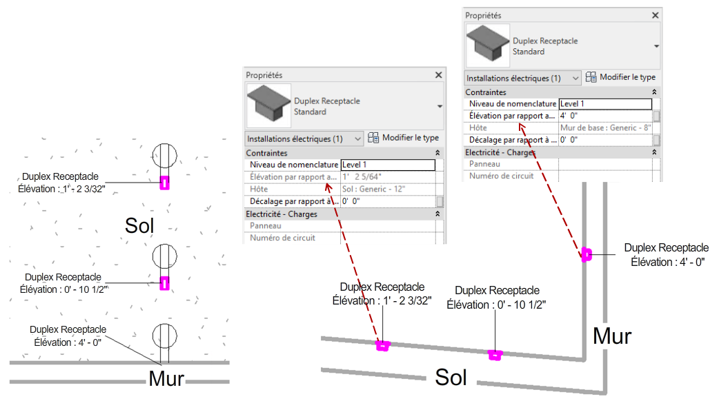Le paramètre Élévation par rapport au niveau n'est pas modifiable lorsque l'élément est placé sur une surface non verticale, comme lorsque vous placez une prise de courant sur le sol ou un luminaire au plafond.