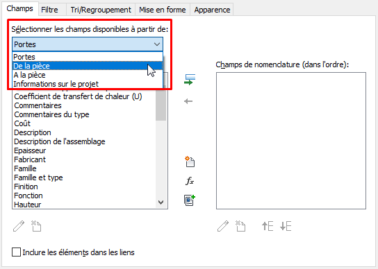 - Dans l'onglet Champs, sous la liste déroulante Sélectionner les champs disponibles à partir de, sélectionnez De la pièce ou A la pièce.