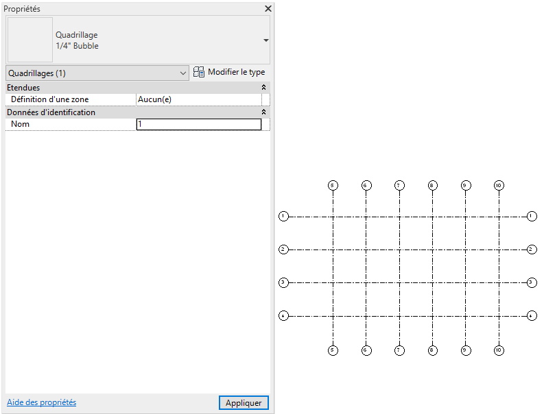 La grille AutoCAD Architecture est créée dans le plan du niveau inférieur du modèle Revit qui ne descend pas plus bas que le contour du modèle de la vue. Les blocs à vues multiples pour les bulles de quadrillage sont ancrés sur les extrémités des lignes de quadrillage et seront créés sur le même plan.