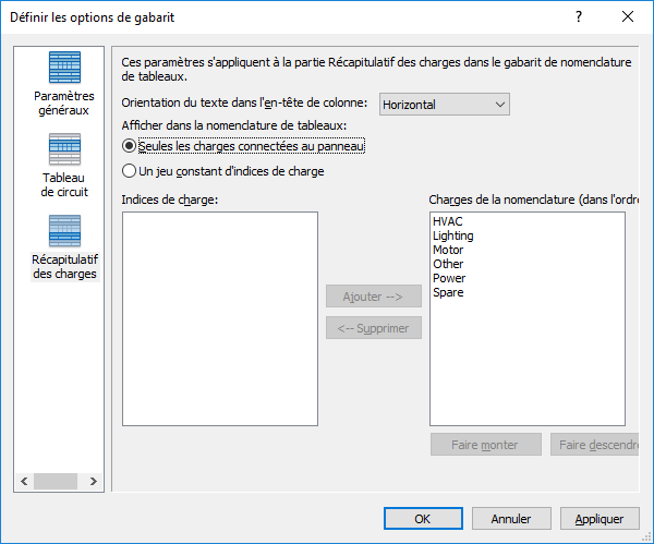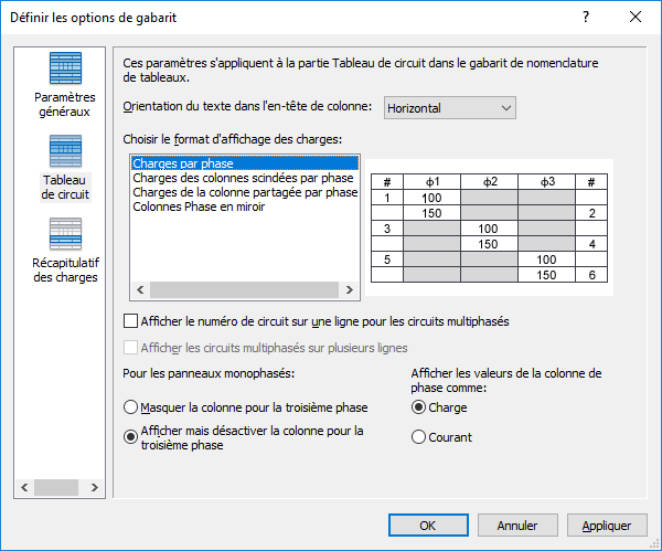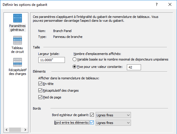 Vous pouvez personnaliser l'apparence des nomenclatures de tableaux. Vous pouvez spécifier les paramètres d'aspect général, ainsi que les informations concernant les circuits et le récapitulatif des charges.