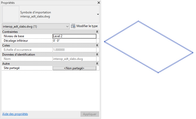 Les propriétés suivantes d'une dalle AutoCAD Architecture sont conservées lors de son importation dans Revit :