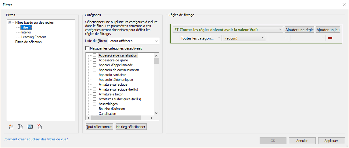 Créez un filtre de vue permettant d'identifier les éléments en fonction de catégories et de valeurs de paramètres.