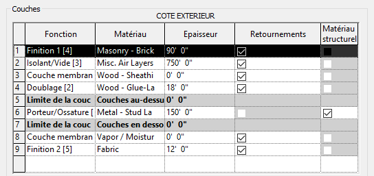 Une couche est affectée à une seule rangée. D'épaisseur constante, elle permet de prolonger la hauteur du mur. Vous pouvez modifier l'épaisseur d'une couche dans la rangée qui lui a été affectée. Vous pouvez également affecter un matériau à chaque couche.