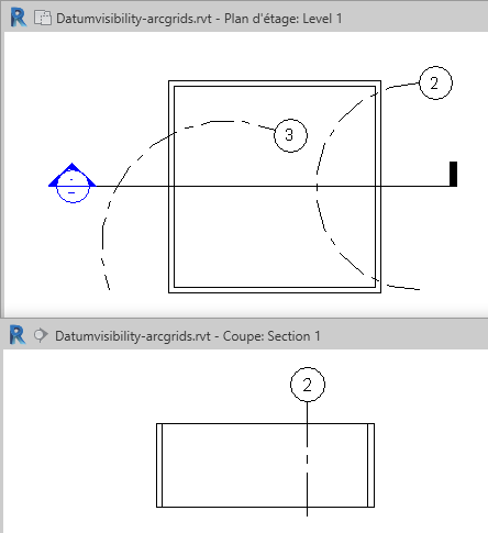 Les lignes de quadrillage en arc s'affichent dans les vues en coupe lorsque le centre de l'arc croise la ligne de coupe et lui est perpendiculaire.