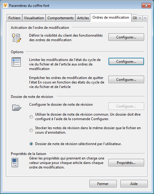 Paramètres du coffre-fort. L'onglet Ordres de modification contient les options de restriction de changements d'article aux ordres de modification en fonction du cycle de vie ou de l'état, de configuration du dossier de notes de révision, de gestion des propriétés de liens des ordres de modification et de définition des schémas de numérotation des ordres de modification. Vous pouvez également désactiver la fonction Ordres de modification.