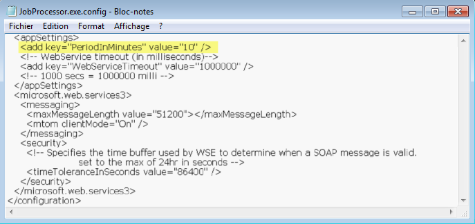 Par défaut, Job Processor recherche de nouvelles tâches sur le serveur toutes les 10 minutes. Cette durée peut être ajustée en modifiant le fichier JobProcessor.exe.config.