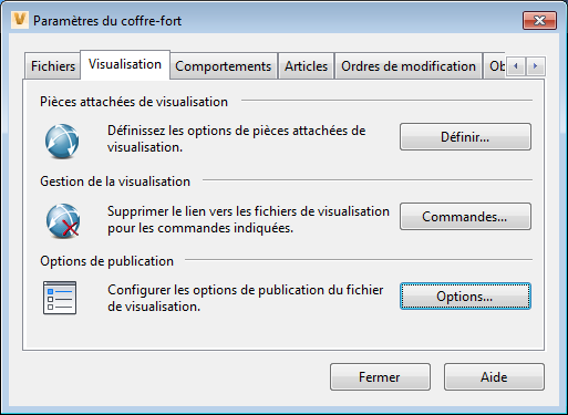 Les options Gestion de la visualisation permettent de désigner les commandes ayant pour effet de couper le lien entre un fichier de données dans le coffre-fort et le fichier de visualisation correspondant.