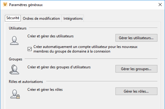 Vous pouvez gérer les rôles et les autorisations correspondantes dans la boîte de dialogue Rôles.