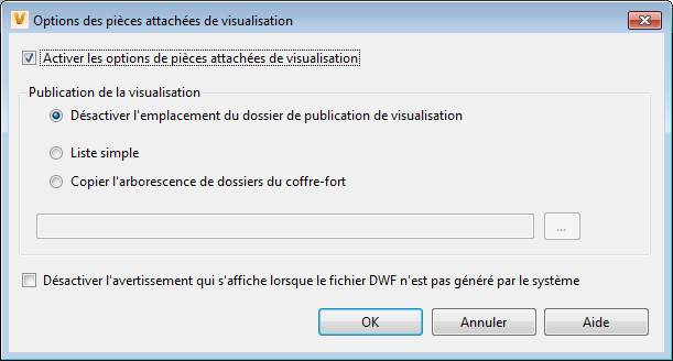 Activez ou désactivez les pièces attachées, indiquez où les pièces attachées de visualisation sont publiées et activez ou désactivez les avertissements DWF dans la boîte de dialogue Options des pièces attachées de visualisation.