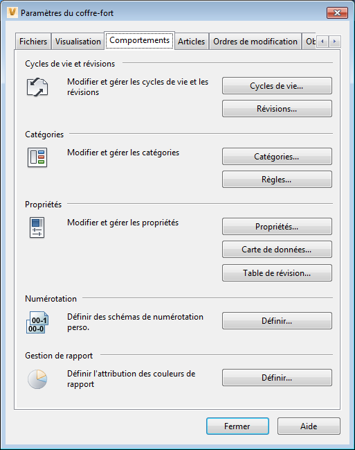 L'onglet Comportements de la boîte de dialogue Paramètres du coffre-fort contient des options pour la modification des définitions du cycle de vie et la gestion des révisions, l'administration des catégories et des règles, la création et la modification de propriétés, la définition de schémas de numérotation personnalisés et l'attribution de couleurs aux rapports.