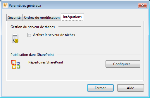 Activez le serveur de tâches et configurez les paramètres de publication vers des répertoires SharePoint dans l'onglet Intégrations de la boîte de dialogue Paramètres généraux.