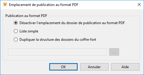 - Désactiver l'emplacement du dossier de publication au format PDF : désactive la publication de fichiers PDF en local. Les fichiers PDF générés automatiquement continuent à être créés dans Vault Client.