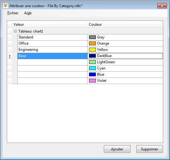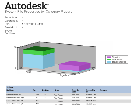 Plusieurs gabarits de rapport sont fournis avec Autodesk Vault Client. Ces gabarits de rapport contiennent une palette de couleurs pour un graphique, mais les gabarits ne spécifient pas quelle couleur est attribuée à quel élément de graphique. Vous pouvez spécifier la manière dont les éléments du graphique sont identifiés par des couleurs lorsque vous utilisez la fonction de mappage de données. Les éléments de graphique avec code couleur permet un affichage rapide et itératif des données du modèle.