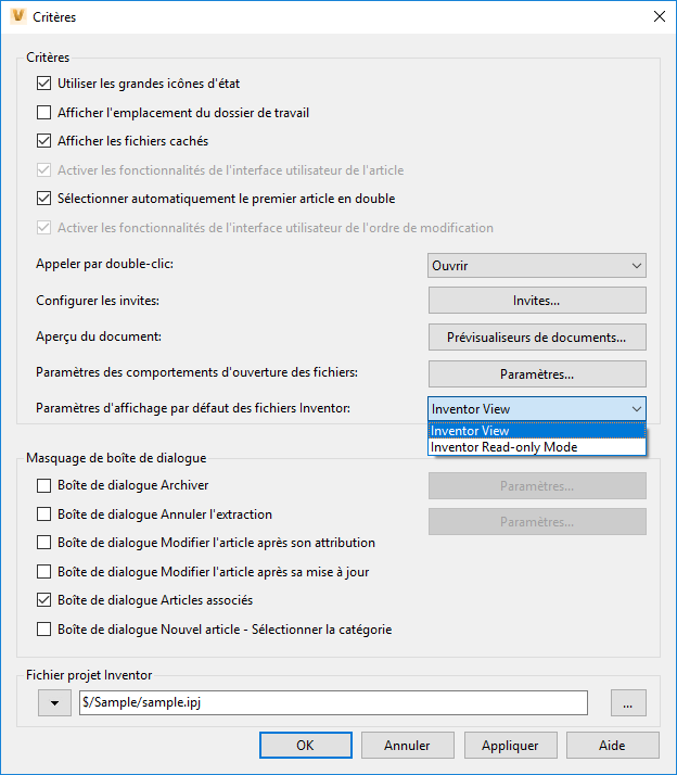 - Paramètres d'affichage par défaut des fichiers Inventor