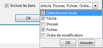Chaque définition d'objet personnalisé définie dans un coffre-fort apparaît dans l'option Inclure les liens. Les liens contenus dans les objets personnalisés sont suivis en fonction du reste de la sélection. Par exemple, si un administrateur a défini un objet personnalisé appelé Tâches, et que l'utilisateur choisit les liens vers les Tâches et les fichiers, alors tous les fichiers qui sont associés à la tâche seront inclus dans le jeu de téléchargement.