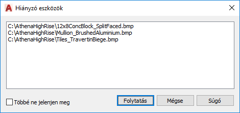 Ez a párbeszédpanel az olyan jelenetek renderelésekor jelenik meg, amelyek textúratérképeinek az elérési útvonala már nem érvényes. Ez akkor fordulhat elő, ha a textúratérképeket áthelyezték vagy törölték, vagy ha a rajzfájl lett áthelyezve egy eltérő meghajtótársításokkal rendelkező számítógépre.