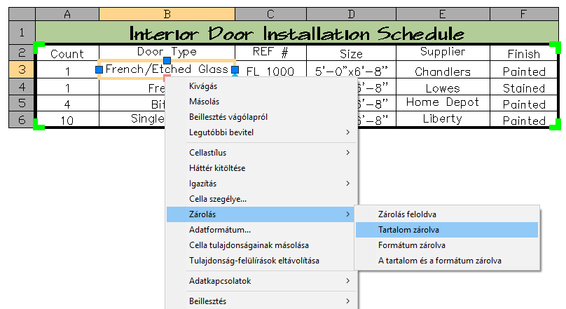 Alapértelmezés szerint az adatkiemelési táblázat cellái nem szerkeszthetők, de formázhatók. A cellák adatszerkesztési és formázási zárolása, illetve a zárolások feloldása a táblázat helyi menüjének segítségével végezhető el.