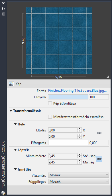 A hely, lépték és ismétlés tulajdonságok aktuális mintázaton végzett módosításainak alkalmazásához ugyanazon anyag más mintázataira válassza a Textúratranszformációk csatolása lehetőséget.