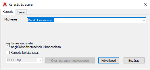 Megkeres minden parancsot vagy parancstulajdonságot írásmódjuktól függetlenül (például a parancs a VONAL és vonal parancsot is megtalálja).