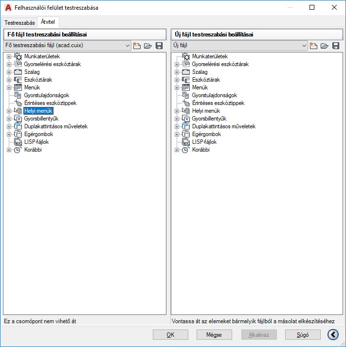 A felhasználói felület elemeit viszi át a fő és részleges testreszabási fájlok (CUIx) között, amelyekben a felületelemek adatai tárolásra kerülnek.