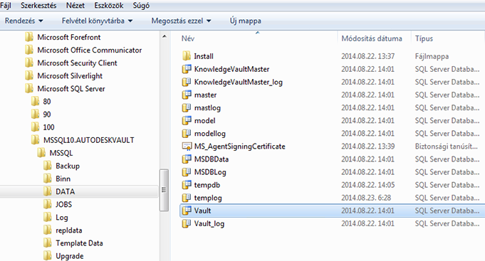Amikor telepíti az Autodesk Vault szervert, egyetlen, Vault nevű Vault tár jön létre. A Vault adatbázis fájljai az MSSQL$AUTODESKVAULT\Data mappában találhatók a Microsoft SQL Server telepítési mappáján belül.