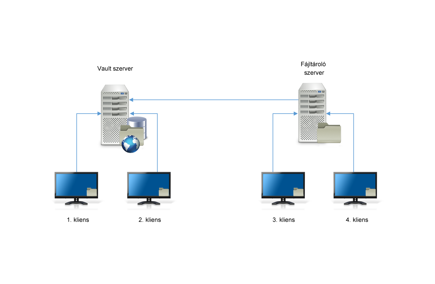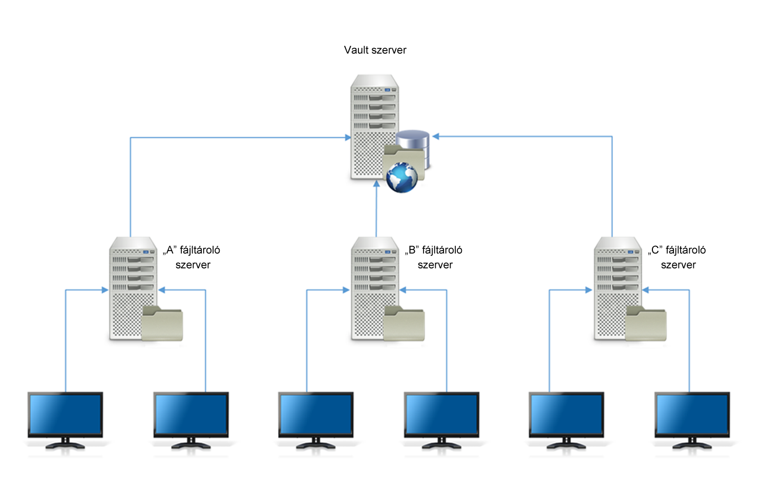 Az első módszer az adatbázis központosítása minden helyhez. A Vault adatbázis különálló szerveren helyezkedhet el, ahogy itt látható.